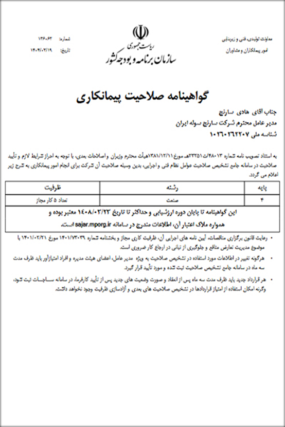 گواهینامه صلاحیت پیمانکاری پایه 4 رتبه صنعت از سازمان برنامه و بودجه